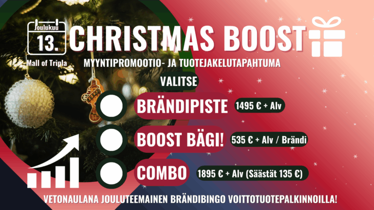 Christmas Boost myyntipromootiotapahtuma valtaa Mall Of Triplan tapahtuma-aukion lauantaina 13.12.2025. Tapahtuma tulee houkuttelemaan päivän aikana yhteen. jopa 20 000-30 000 kävijää.